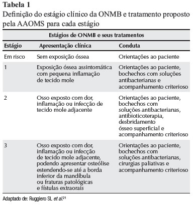 Uma definição do estágio clínico da ONM e o tratamento proposto pela AAOMS para cada estágio estão representados na Tabela 1.