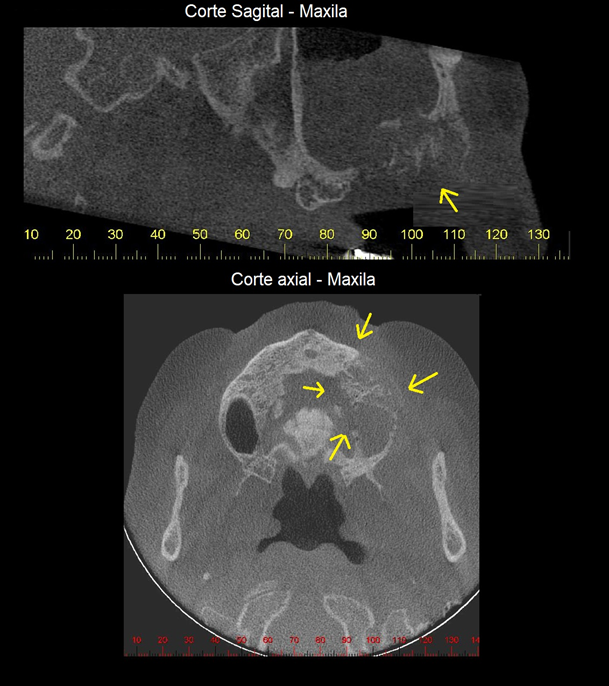 As características radiográficas são de áreas de lise óssea de limites irregulares, acompanhadas, por vezes, de reação periosteal das corticais adjacentes. É imprescindível que as informações como a histórico da doença e o uso de medicações sejam relatadas ao radiologista, quando da solicitação do exame.